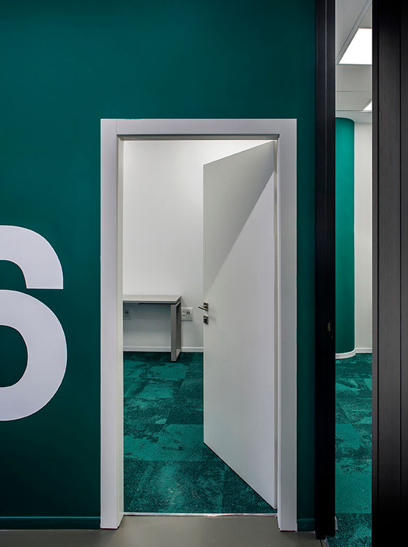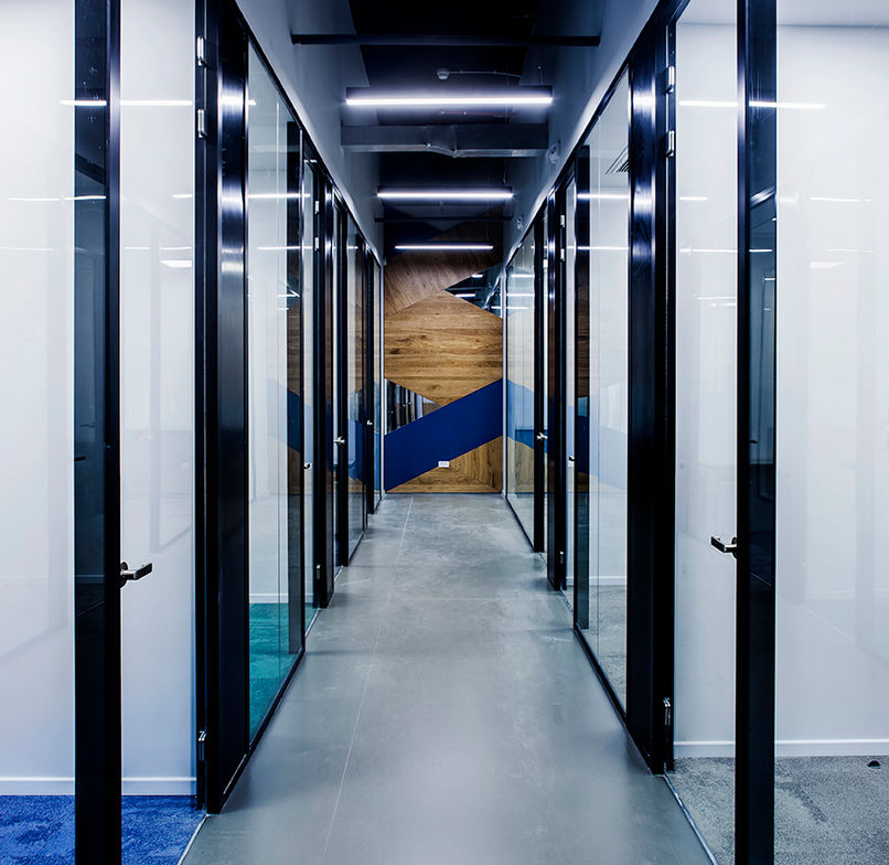 The concept for the company’s offices was to create space that calms the mind and helps the staff focus during their work hours. The overall atmosphere generates an environment that is professional and reliable. An important focus point in the intervention was to create feeling of openness and transparency, we achieved that by installing 3 meters high glass partitions instead of plaster walls. The open ceiling along with multiple shades of grey dictate a space that seems boundless, thus calming the mind. Using blue and green as the accent colors, the space is in perfect sync with the company’s brand identity, as well as visually inspiring calmness, professionalism and motivation.
