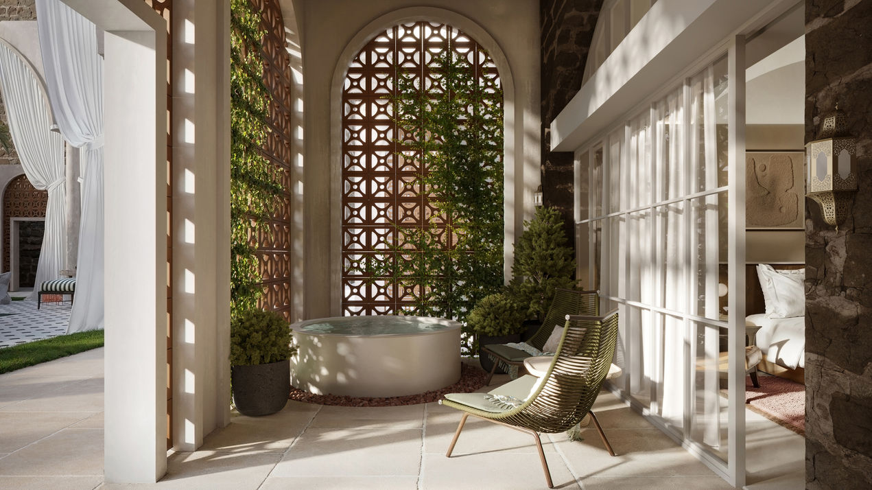 The architectural approach balances heritage preservation with contemporary design. Carefully restored stone facades and traditional masonry screens coexist with modern interior detailing, natural finishes, and a warm, neutral palette. Each guest room opens to the courtyard and includes a private outdoor lounge area, reinforcing the connection between indoor comfort and outdoor tranquility.