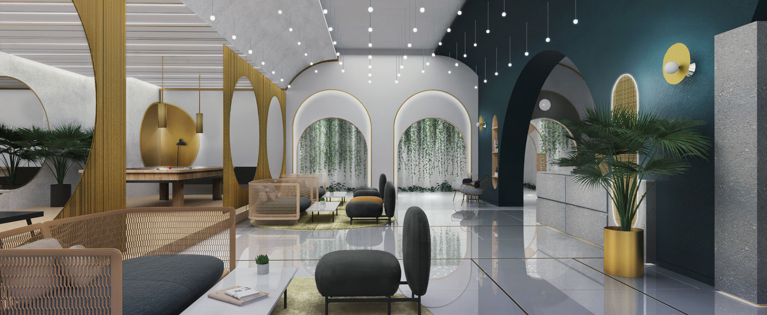 An open space plan connects the various treatment areas through an informal green hallway. Carefully crafted arches help blur height transitions between zones, creating a continuous, flowing experience that enhances relaxation. The color palette plays a key role in the spatial identity, combining bold and pastel tones to highlight certain zones while softening others. This balance contributes to a soothing and immersive atmosphere throughout the spa. Accents of gold and layered artificial lighting subtly guide visitors through the space, reinforcing the open layout and enriching the sensory experience at every turn.